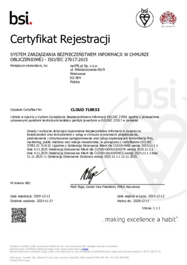 Dzięki certyfikacji ISO 27017 możemy zapewnić bezpieczeństwo informacji w związku ze świadczeniem usług chmurowych, jak i w zakresie korzystania z dostawców chmurowych.