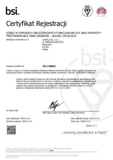 W 2019 roku uzyskaliśmy certyfikacje ISO 27001, ISO 27017 oraz IS0 27018 dla procesów tworzenia i zapewnienia działania oprogramowania.